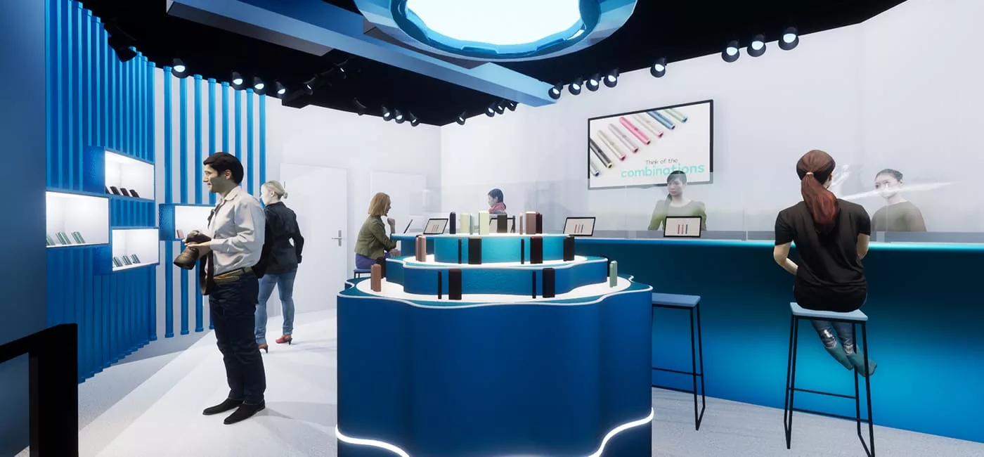IQOS イルマとアクセサリーの全ラインアップが並ぶ2Fでは最新デバイスのカスタマイズをタブレット端末上で体験できるアプリで豊富な色の組み合わせを愉しめます。最後にQRコードで読み取り、ご自身のスマートフォンに保存も可能です。また、地下1FのWaiting スペースではお待ちいただく時間が発生しても愉しめる体験型の映像コンテンツをご用意しています。